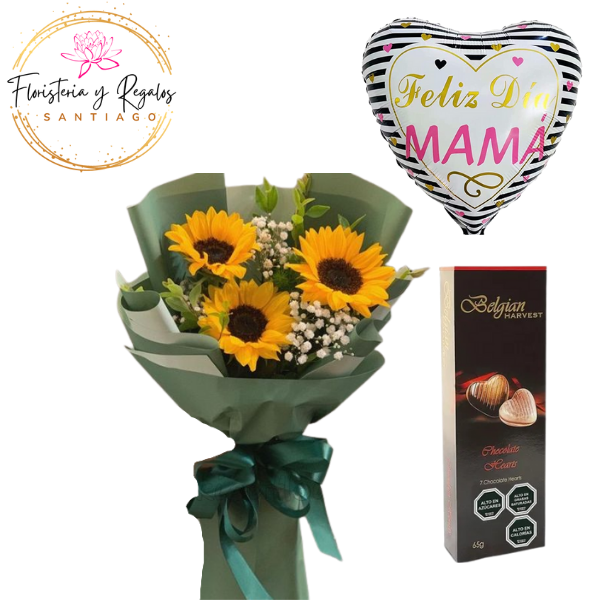 RAMO DE 3 GIRASOLES ENVOLTURA ESPALDA BOMBONES BELGIAN Y GLOBO
