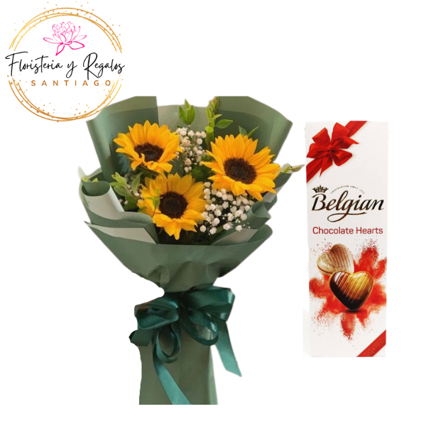 RAMO DE 3 GIRASOLES ENVOLTURA ESPALDA Y BOMBONES BELGIAN