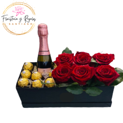 CAJA RECTANGULAR DE 6 ROSAS IMPORTADAS, 6 BOMBONES Y CHAMPAGNE 375ML