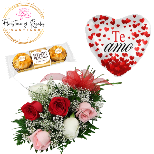 BASE DE 3 ROSAS + FERREROS ROCHER 100GRS Y GLOBOS
