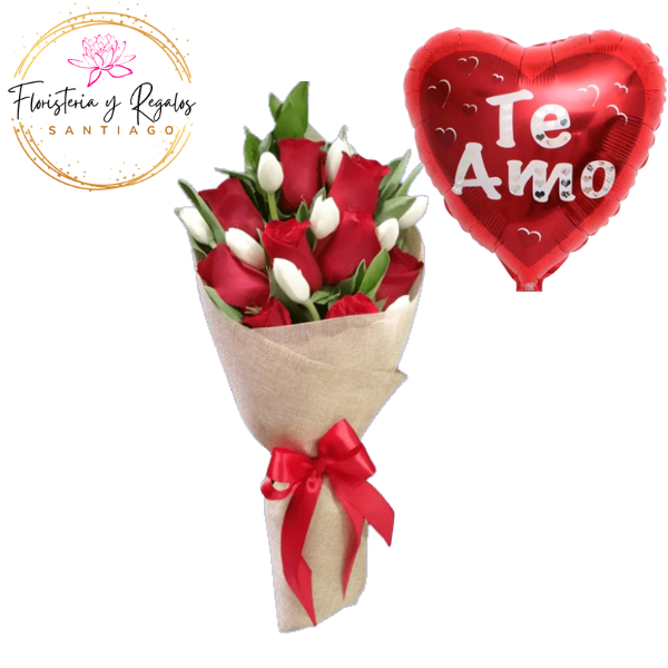 RAMO DE 8 ROSAS 8 TULIPANES + GLOBO