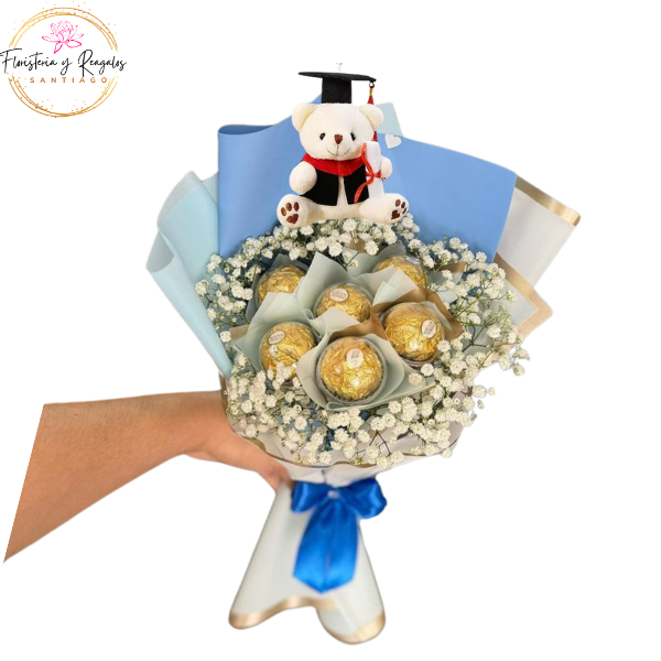 RAMO GRADUADO CON 5 BOMBONES, PELUCHITO LLAVERO Y GYPSOPHILA
