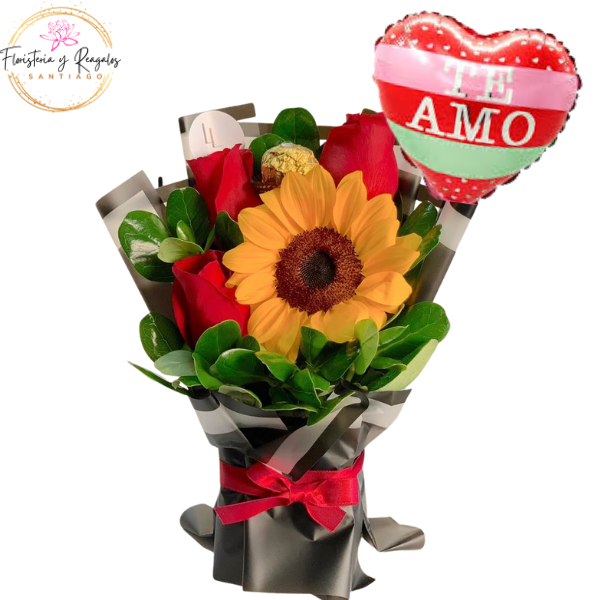 RAMO LOVE CON 3 ROSAS, 1 GIRASOL, BOMBONES Y GLOBITO