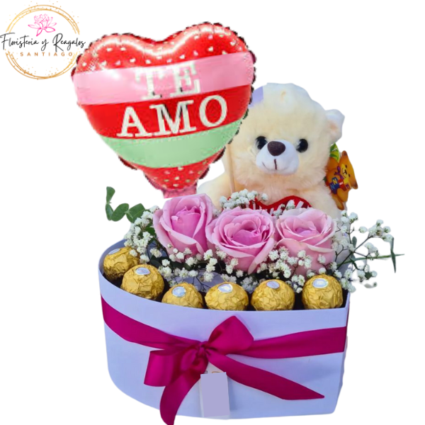CAJA CORAZON DE 10 ROSAS, 3 GIRASOLES Y 5 BOMBONES FERREROS ROCHER