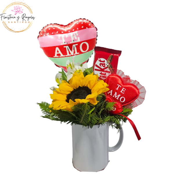 TAZA AMOR CON 1 GIRASOL, 1 KIT KAT, TOPPER Y GLOBITO
