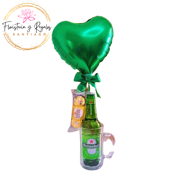 VASO, CERVEZA, BOMBONES FERRERO ROCHR DE 3 UNI Y GLOBO